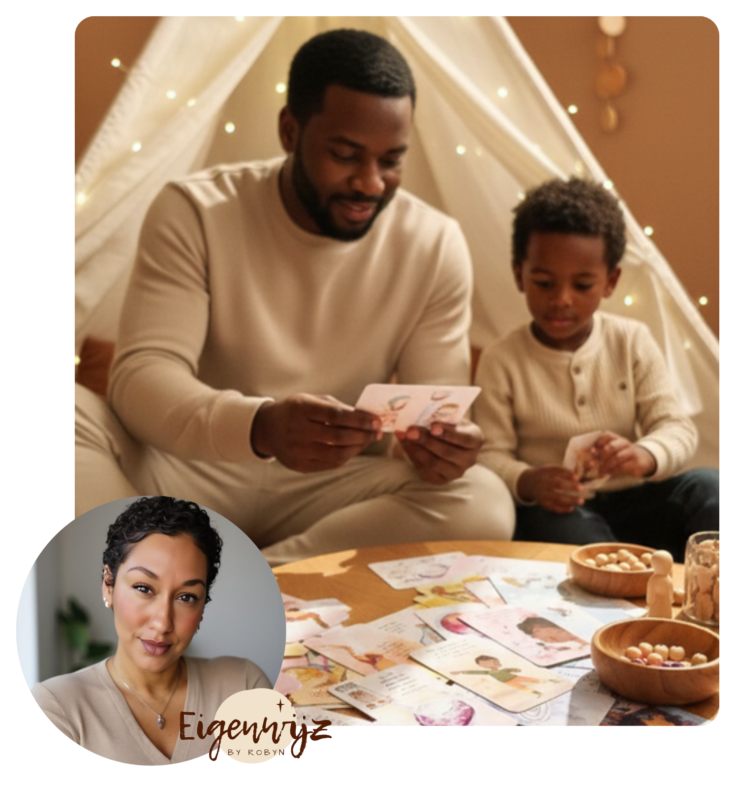 Ik ben Robyn. Moeder, pedagoog en maker. Alles wat Eigenwijz is, is ontstaan vanuit mijn eigen leven: mijn kinderen, onze roots, cultuur en mijn werk met gezinnen en professionals. Aan bedrandjes, in overgangsmomenten van de dag, in periodes van onrust en juist in de kleine, zachte momenten waarin alles even klopt. Ik zie hoe snel kinderen zich aanpassen aan de wereld om hen heen en hoe makkelijk ze daarbij iets van zichzelf inleveren.