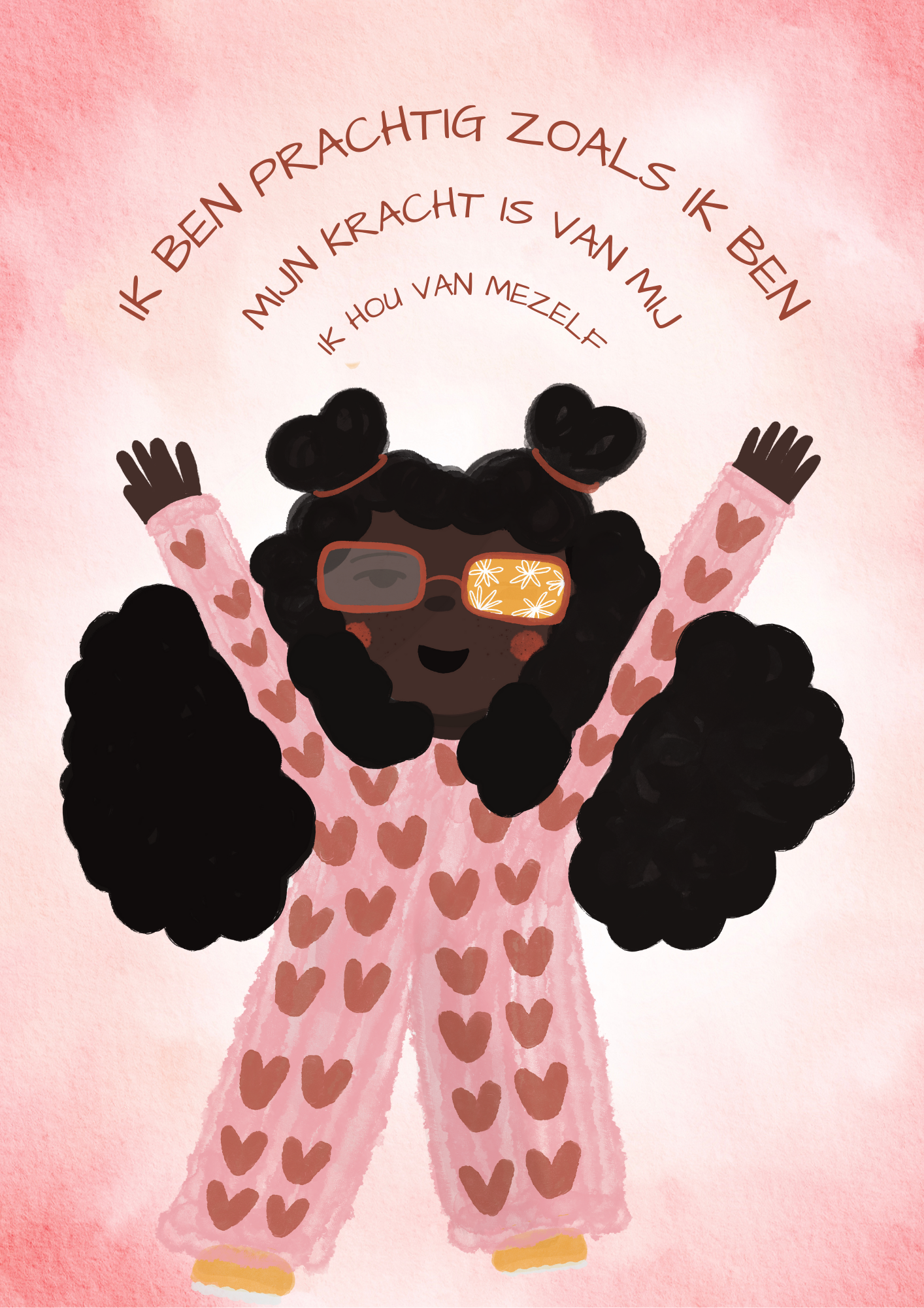 Een liefdevolle poster voor de kinderkamer, speelhoek of klas, waarin een kind zichzelf herkent als mooi, waardevol en compleet.