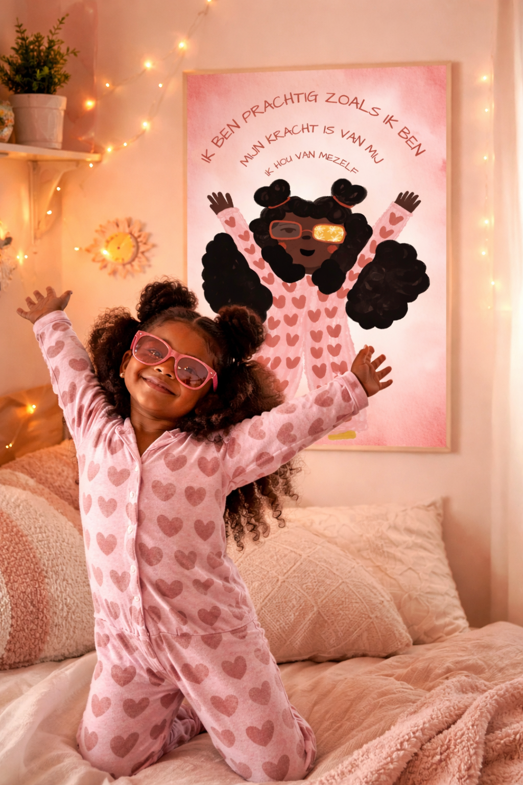 Deze krachtige A3-poster toont een meisje van kleur met een prachtige bos haar en een lui oog, stralend in haar eigenheid. Een beeld dat zegt: ik ben genoeg, precies zoals ik ben. De affirmatie “Ik ben prachtig zoals ik ben” helpt kinderen om zichzelf met zachtheid en trots te zien, los van schoonheidsnormen of verwachtingen.