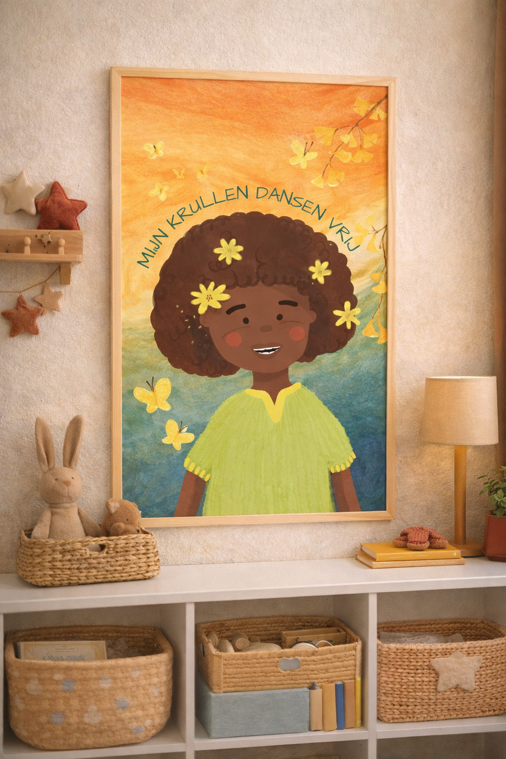 Deze vrolijke A3-poster toont een meisje van kleur met een prachtige bos krullen vol beweging, licht en zelfvertrouwen.